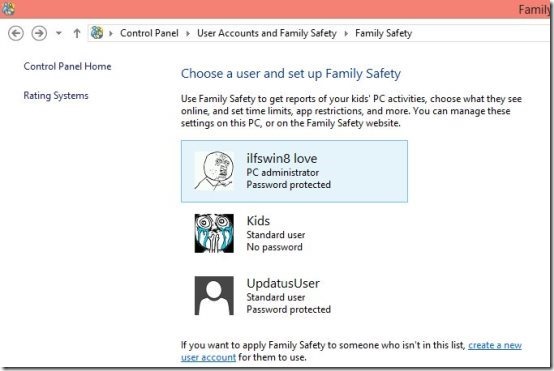 - Once you have completed the steps as above; you will be able see all the users of the computer listed as shown below. Here, you are supposed to select the account for which you want to set up Family Security.