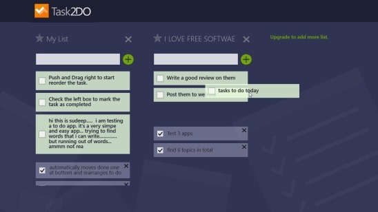 Task2DO, is a free Windows 8 to-do app. It provides you with a beautiful, sleek, and minimalist medium to create and manage the to-dos. The app is a simple but useful app, where you can create a new list and then add tasks inside them, in way too easy and quick medium. And then once the task is done, you can move them to the list of done tasks with just a single click or remove them completely from the list by just clicking on cross button. The app also lets you rearrange tasks of a list, according to their current priority. So that, you can manage your to-dos properly and finish important tasks first.