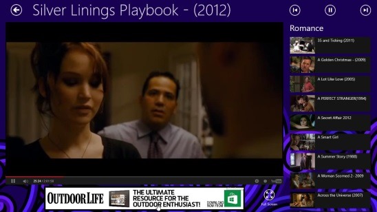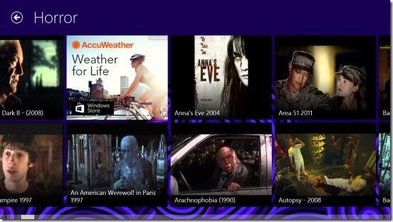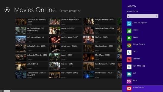I liked that most of the movies have good enough video quality. Like I mentioned above, you can watch movies in normal as well as full screen mode. If you are in normal mode then all the movies under that genre get listed on the right side of screen. Rest of the screen is covered by the video. The Ads are there, but they won’t bother much. The integration of Windows 8 Search charm is one interesting feature, and it makes finding a movie fast.