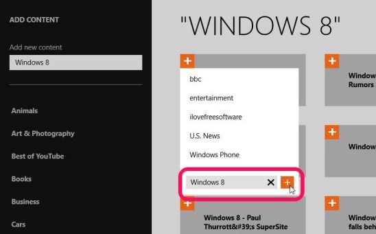 All you have to do is enter the Topic, Website name, or RSS URL, for example: Windows 8, Microsoft, Baseball, BBC etc., and hit Enter key. The app automatically gives the related search results. The search results are good, but I wished they were little more in number and they were not too relevant; specially when you are looking for a source which is not too popular. Once you found the requisite source, simply click on the Plus icon, and click on one of the default category. You can also create your own category! Just, in place of clicking on the prebuilt category in aforementioned steps, type the custom category in the Add New Category text field and click on Plus icon besides that text box. That source gets added to your news sources list, and appears in the Home Screen.