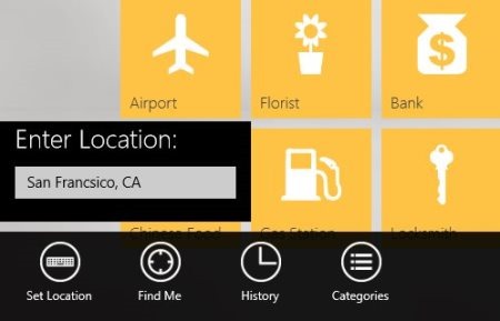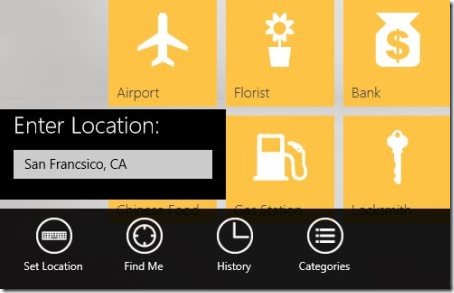 As you open the Yellow Pages Windows 8 app, you will be asked “Can Yellow Pages use your location?”. Click on ‘Yes’ and proceed further. On the home page, you will find four different columns. ‘Popular’ at the very first place, following with Restaurant, Pizza, and Mechanic. Soon, your place will be detected by the app, and now you can click on any category to view details. However, in case you want to change the location and want to find places of other areas, just right-click anywhere on the screen → a horizontal panel will open consisting of options such as Set Location, Find Me, History, and Categories → click on ‘Set Location’ and enter the desired location.