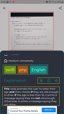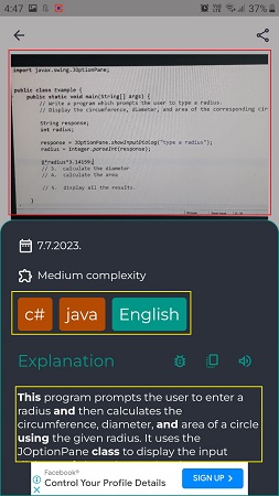 4. Next, tap on the tick mark icon at the top right of the screen and wait for some time while Photocode processes and analyses the image and presents the Explanation of the code on the screen. The language of the code as well as the programming language are identified and displayed along with the explanation.