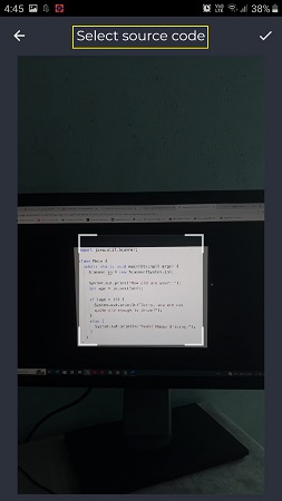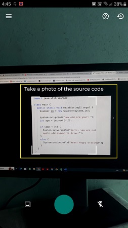 2. Launch the application and when prompted, take clear picture of the source code that you wish to analyze. You can increase the area of capture by dragging the image size handles at the corners. To upload an existing picture of a source code from the gallery, you can tap the icon at the bottom left.