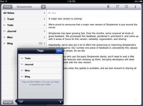 The interface is very extremely simple yet powerful, however, there are two main modes: one with a list of your notes, and icons for regular actions, other with a full screen mode for enabling you to focus on your writing. To create a new note, just tap on plus icon given at the top right-side of the iPad screen. Simplenote is very handy tool that enables you to instantly share on whatsoever topic you are working.