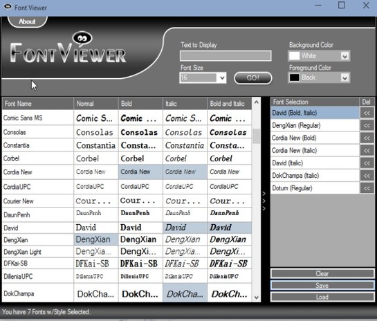 Bulk of the interface is used up by the list of fonts. List has 5 columns, 1 for the font name, and 4 others for previews of fonts (one column each for normal, bold, italic and a combo of bold and italic). Font list can be selected and then exported as TXT, PDF or Font Viewer’s own native format, FV.