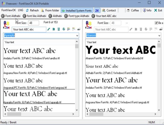 Not only that system fonts can be previewed, but you can also use this font viewer software to preview downloaded fonts, from folders, fonts that you plan on installing. Use the toolbox above the preview list to select fonts and also to tweak font preview text.