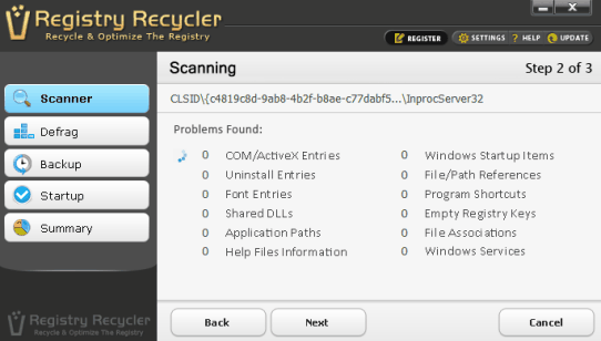 Registry Recycler is another useful entry in this list. It comes with registry scan scheduling feature, manage startup entries, backup and restore registry, and defragment Windows registry. It provides a very simple interface and helps you to clean registry in just three simple steps. In first step, select areas for scanning. This may include file/path references, shared DLLs, Windows services, help files information, program shortcuts, uninstall entries, startup items, COM/ActiveX entries, and more. You can also select all areas for full scanning. Second step includes scanning process which can take some time. Final step is to clean errors. You can also uncheck items that you don’t want to remove. Interesting part is that before starting the cleaning process, a backup for registry is created automatically. Using backup section available at left side of its interface, you can restore any backup.