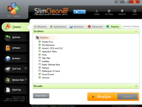 SlimCleaner is really a handy registry cleaner software that comes with cloud-based optimization engine. It find errors in registry as well as lets you clean those errors. Shared DLLs, help files, services, application paths, installers, ActiveX, COM, and OLE, empty software keys, startups, sound events, and MUltilingual UI cache can be scanned for errors in registry. Scheduling feature is also available to schedule registry scan or clean process (daily or weekly). Before performing cleanup process, it automatically creates registry backup which can be used to undo changes as well. Apart from this, you can use it to clean Windows log files, memory dump files, search history, thumbnail cache, browsers cache, cookies, history, saved passwords, compact databases, and much more. It uses so-called crowd-sourced technology and provides settings that are needed to optimize your programs, services, and startup items, based on community sourced feedback. It provide separate section to clean registry, Windows items, and browser stuff.