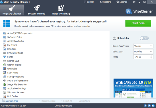 Wise Registry Cleaner is one of the best registry cleaner present in this list. It provide features such as: schedule registry scan, tune up your PC in a single click, and defragment registry. While analyzing registry for fragmentation, your PC will not respond for some time, but it is a normal behavior. This registry cleaner can scan registry for invalid Windows services, missing shared DLLs (dynamic link libraries), invalid Windows Firewall settings, file extension information, User MRU lists, useless uninstallation information, invalid ActiveX and COM components, and more.