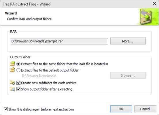 On the lookout for a simple yet feature loaded application for extracting all those RAR archives? Free RAR Extract Frog is all what you need. Funky name aside, it lets you extract even the biggest of RAR archives in a matter of seconds. Free RAR Extract Frog is easy to work with, thanks to the wizard like approach it employs towards extracting archives. To begin, hit the Unrar button, and the extraction wizard should pop up. Here, you can also specify advanced options, such as automatic creation of a new sub-folders, extraction of archive to the default output folder (configurable in settings), and more. Once done, click OK button, and Free RAR Extract Frog will take it from there. If the RAR archive is password protected, the next step of the wizard will automatically prompt you to enter the same. Then there are features like saved passwords list, skins, and things like that. Click here to read more.