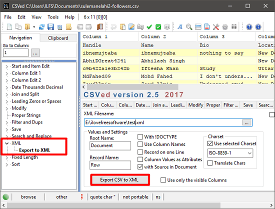 CSVed is a one of the best free CSV to XML converter software for windows. The software is very handy and can easily convert a CSV file to XML format. The software organizes a CSV file on its interface in the form of rows and columns and you can easily edit them if you want. After that, you can use the Export option from the software to save the CSV file as XML file. You can specify some output options like one record per line, include !doctype, use column name, column values as attributes, charset, etc. And not only XML, the software allows you to save a CSV file to a large variety of file formats including HTML, PDF, Excel, etc.