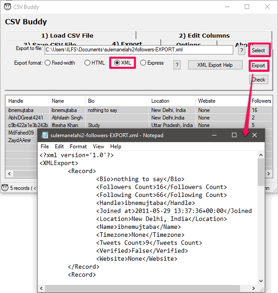 It’s pretty easy to convert a CSV file to XML using the software. Get the portable executable of CSVbuddy from above link and then launch it after downloading. Next, load a CSV file in it using the Select button and then it will show you the CSV file. Now, move to the Export tab and then click on the XML option. After that, specify the location where you want to export the converted CSV file. Finally hit the Export button and then the file will be exported to the folder that you have specified.