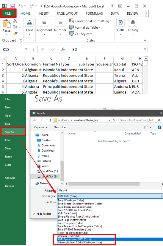 Apart from using any third-party software to convert CSV to XML, you can also use common spreadsheet software like Excel, Libre Office, or Open Office. All of these have a built-in feature to convert a CSV file to XML file. Let me demonstrate that for Excel. It uses the headers of each column and row number as tag attribute in the XML file. And it is pretty easy to convert a CSV file to XML using MS Excel. Just open any CSV file via Excel that you wish to convert to XML. After opening the CSV file, use Save it as XML file. Go to File menu and click on the Save as button. From the Save as dialog, use the file type drop down and choose XML spreadsheet option from it. And finally hit the save button to save the CSV file as XML file.