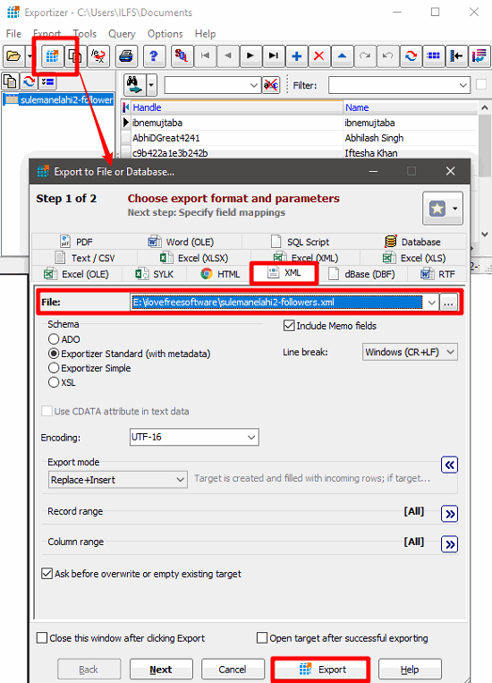 To convert a CSV file to XML file using Exportizer is very easy. Download and install it on your PC using the above link and then open it up. Use the File > Select data source menu to load a CSV file on to its interface. After that, you can make changes in the CSV file if you want any. And when done, click on the Export tool from the toolbar of the software. After that, a window will pop-up and you will see a lot of tabs in it. Navigate to the XML tab and then specify the encoding, file path and name, liner breaks, etc. After all set, hit the Export button and then the CSV file will be converted and exported.