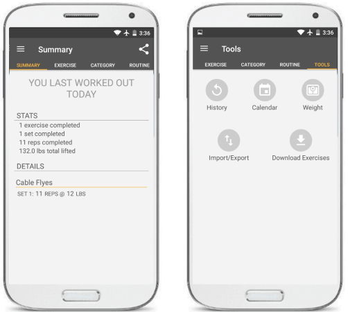 FitNotes is a very straightforward workout log book app that you can use on your phone. You just have to select an exercise from the list, specify the details of weight, reps and sets and then save them. You can add every exercise that you perform daily and then it will keep saving them on the current date. There is a calendar as well which you can use to see the exercise that you performed on a specific day. It makes it easy to log exercises and you can audit then later using its pretty simple interface. Apart from logging, you can use this app to share your workouts from a specific date over emails, message, Bluetooth, etc.