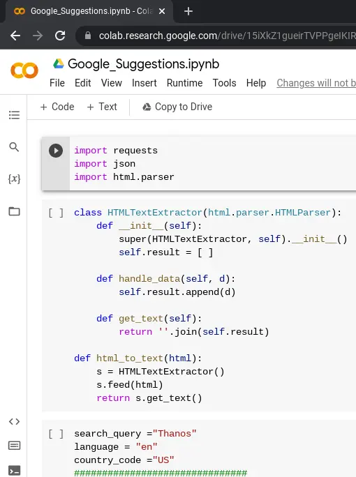 - Now, start running the Notebook. Hit the play button orderly in every cell, starting from the top. In the last cell, you will get the output, It will show 10 top most Google Search suggestions now.