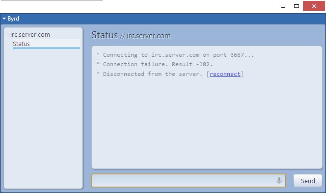 Where it’s different is the setup. The very first thing that you’re gonna see after running Byrd is a settings window where you’ll have to type in details of the IRC server that you’d like to use. Notice also that voice chat is also available here. It can be activated by clicking on the microphone icon.