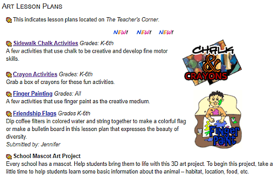 TheTeachersCorner offers art lesson plans and activities to teachers and parents for free. These lessons include various types of creative art-focused activities for classrooms. They provide resources and guidelines for a variety of artistic mediums. Each lesson contains an activity along with directions and list of needed supplies for that. Here, you can plan art lessons for kindergarten to 6th-grade kids.