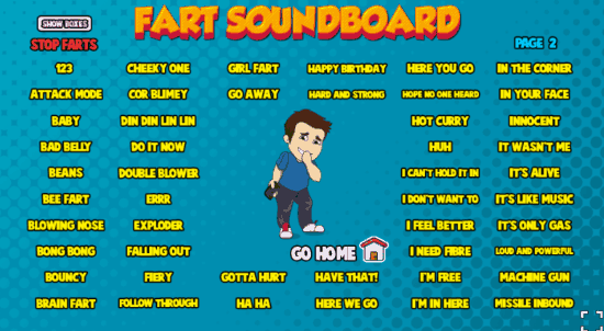 Similarly, fart soundboard can be played to prank people. The soundboard has a cartoon in between holding a soundboard. When you click on any fart button, it makes a funny noise like a fart.