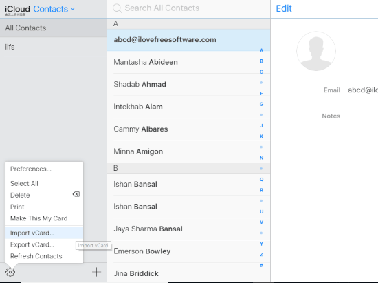To view VCF file contacts, login to your iCloud id, then use Contacts option. After that, you can use Settings icon available on the bottom left corner and use Import vCard option. You can see the same in the screenshot above. This way, you can add contacts from vCard file and view them.
