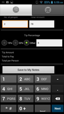 Notice at the top that there are 2 tabs. First one calculates tip amount on a single amount, while the second one performs it on multiple amounts at the same time. This tip calculator app has note integration, meaning you can copy calculated values into your notes app for later use.