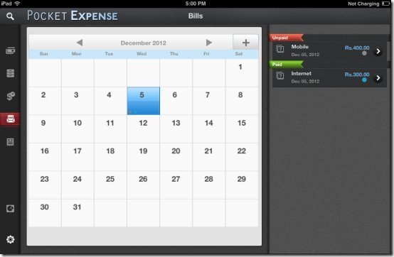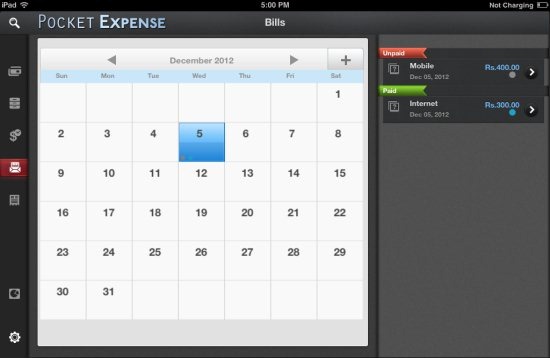 The best part of this iPad expense tracker app is its recording the paid and unpaid bills. The app lets you record all the bills which you have to pay and gives you reminder for every bill on the due date or before. After paying the bill, you can easily mark any bill as paid which helps you to keep a track of all the paid and unpaid bills.