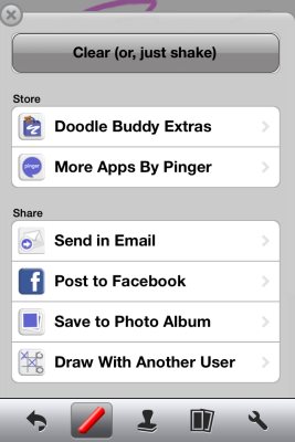 The fifth icon is for settings, as can be seen in the above screenshot the first option you will see is to clear the canvas. You can also clear the screen by shaking your phone. Apart from this you get sharing options like mail the drawing to a friend or even publish it to Facebook. You also get the option to save the drawing to your photo gallery. For collaborating on a drawing you can use the option provided here.