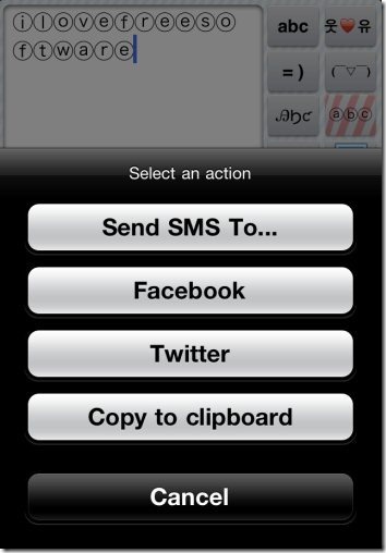 Apart from copying the text to clipboard, this keyboard app for iPhone also lets you embed the text directly to messaging application, Facebook, and Twitter. This makes it easy for you to directly copy the text to your default SMS text field. The only option which I was missing in this app was sharing the text directly via Email. The app developers should include the option of exporting the text directly to the text field of email. For now, you can copy the text to clipboard and then paste in email.