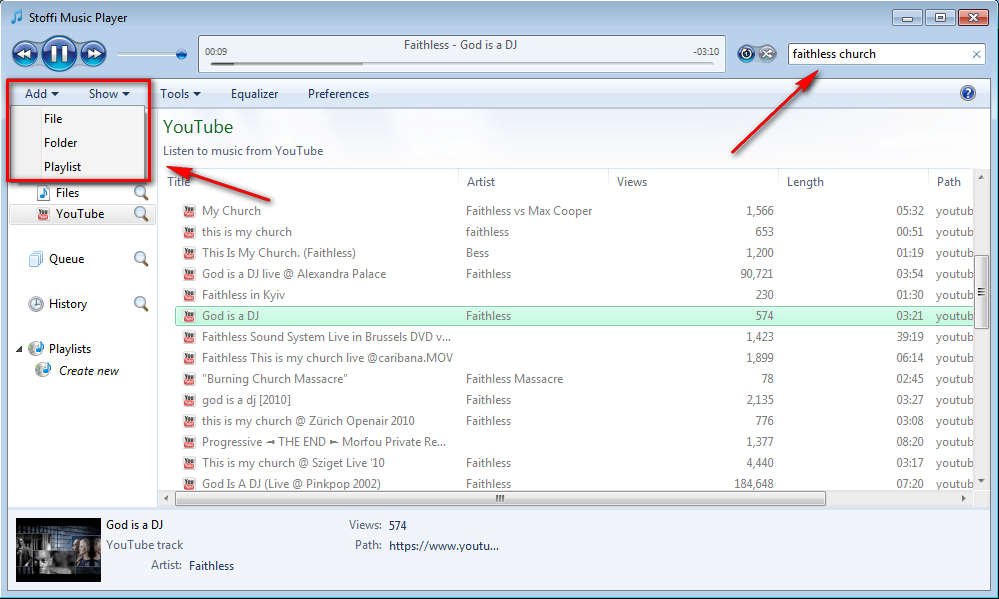 Individual files, entire folders or already saved playlists can be opened. All the major audio and playlist formats are supported, so unless you have songs in some obscure extensions, you shouldn’t worry about not being able to listen to music with the help of Stoffi. Even if you can’t open your music collection, there’s always YouTube which you can use to find songs online:
