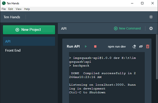 Ten Hands is a free software to run multiple command line tasks from one place. In this software, you can add different projects with corresponding commands and then save them. Advantage is that you will not have to open multiple terminal windows to run some commands. In just one click, it lets you execute any command from any project and then you can stop that in one click too. Here you can create as many projects as you want and specify the commands you want to execute. The interface is very simple and you can use it anytime you want.