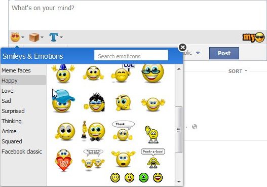 1. Smileys and Emoticons: In this category there are sub sections like: Meme faces (these include meme faces with different expressions), Happy (these include normal happy emoticons), Love (these include emoticons of love expressions), Sad (these emoticons are used to express sadness), Surprised (these include emoticons of surprise expressions), Thinking (these emoticons are used to show that you are thinking of something), Anime (these emoticons include mostly girly icons), Squared (these include icons in squared fashion), and Facebook classic (these are classic Facebook icons).