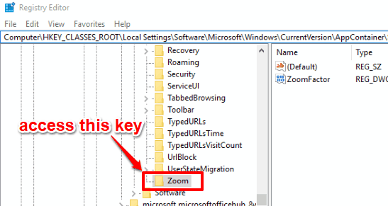 Step 3: In Registry Editor, there is a “Zoom” key, under Microsoft Edge key. This key can be accessed by exploring HKEY_CLASSES_ROOT key. Follow this path for Zoom key: Computer→ HKEY_CLASSES_ROOT→ Local Settings→ Software→ Microsoft→ Windows→ CurrentVersion→ AppContainer→ Storage→ microsoft.microsoftedge_8wekyb3d8bbwe→ MicrosoftEdge→ Zoom.