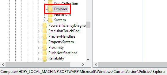 Step 2: After opening the Registry Editor, access the Explorer key. It is available here: HKEY_LOCAL_MACHINE → SOFTWARE → Microsoft → Windows → CurrentVersion → Policies → Explorer.