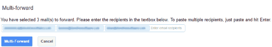 Multi-Forward for Gmail is a Chrome extension that you can use to multi-forward Gmail emails to single recipient at once. The best part of this method is that you can perform this task right within from Gmail web interface. You can even use it to forward multiple Gmail emails to multiple accounts at once. Getting started with this free Chrome extension is really easy, you just have to install it and then it will add a Multi-forward button in Gmail which you can use to forward multiple Gmail emails to single or multiple recipients at once.