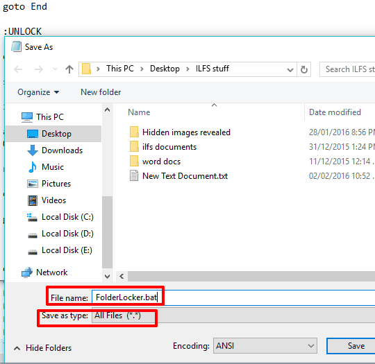 Step 4: Save the file as ‘FolderLocker.bat‘ within the same location. Select Save as type to ‘All Files (*.*)‘ and then enter file name as FolderLocker.bat.