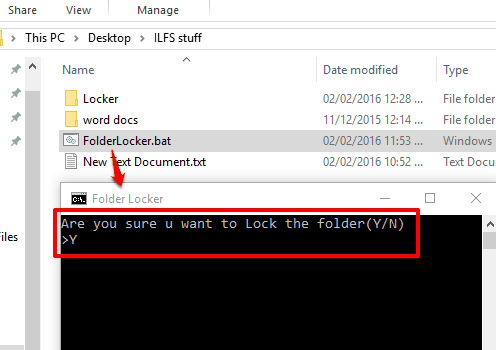 Step 7: Execute FolderLocker.bat file again. This time, it will open a Command Prompt window. It will prompt you whether you want to lock the folder. Press ‘Y‘ and then enter to confirm your action.