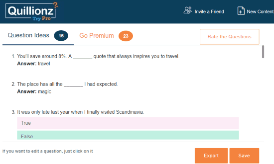 If you are a teacher by profession then this tool is going to help you a lot. Using this website, you can generate quiz questions just by uploading a text content. This is a great tool to get ideas for preparing a quiz. After editing the questions, you can save or export the questions and take prints.