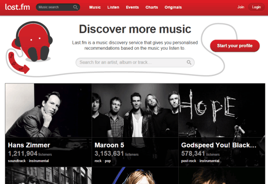 Last.fm is also a very popular music website where you can discover music by artist, album, and track. You can also upload your own music (without any limit) using its Music Manager feature. However, you must upload MP3 files with 128 kbps bitrate or above.
