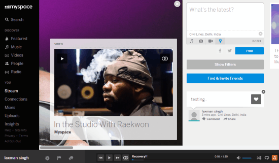 Myspace is the last Grooveshark alternative in this list. Here, you can sign up or login with Facebook for a free account, and can upload your music tracks. Maximum file size per file is 1 GB and total free storage provided to you is 2 GB. You can upload FLAC, MP3, AIF, AAC, and WAV format audio tracks.