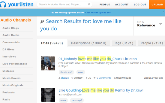 YourListen.com is a fantastic music streaming service that I personally like a lot. It offers unlimited music streaming and discovering latest sound tracks and music provided by podcasters, Musicians, DJ’s, etc. You can also upload unlimited number of audio tracks and music. While uploading an audio file, options to set privacy, enable/disable download for that track, add tags, set rights are also available. Moreover, if you are already selling your audio tracks on some services, say Amazon, Juno, iTunes, etc., then you can also insert links to those services.