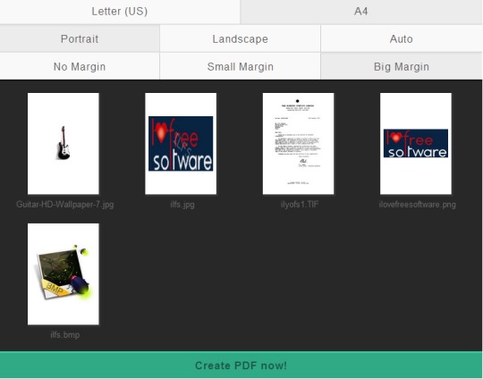 Once you have added all the images, you can adjust output settings for pdf file. Settings such as whether you want to create A4 size pdf file or Letter size pdf. Moreover, you can also set margin and size (portrait, landscape, or auto) for output file. Once you are satisfied with changes, hit the Create PDF now! option and it will generate pdf file for you which will start download automatically.
