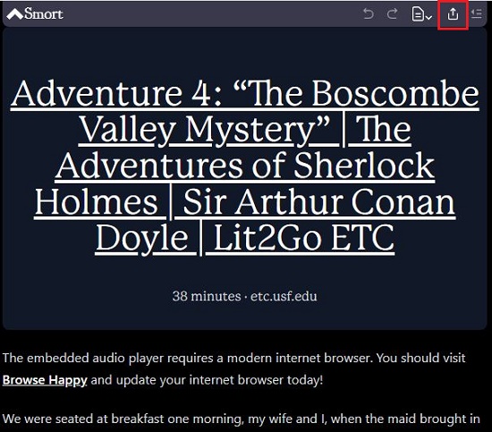 2. Prepend smart.io/ before the URL of the selected website (smart.io/<URL>) in your browser and press enter. In just a few seconds, the content of the article will be parsed and made available for Smort editing.