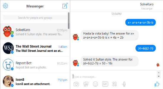 SolveKaro is a very interesting and useful chatbot for Facebook Messenger, which allows you to easily perform various mathematical calculations in a flash. After using this chatbot, I was able to calculate different math problems like quadratic equations, trigonometric functions, basic linear equations, and more with ease. So, give it a try and get rid of complex calculator software.