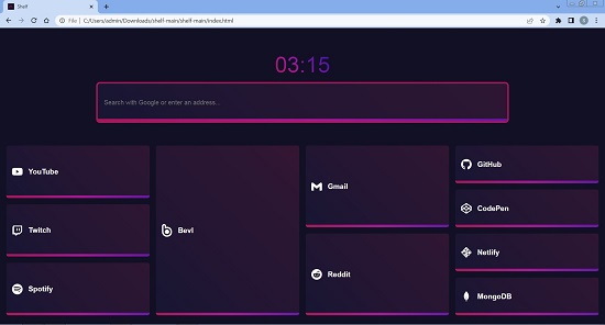 Shelf is an open-source and fully customizable browser start page that displays the clock, search bar, most visited sites and bookmarks in grid enabled layouts with cool gradient designs.