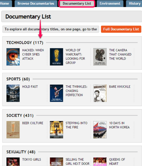 - 25 different categories are available in this website that have hundreds of documentary videos. You can click on Documentary List tab to explore all documentary categories.