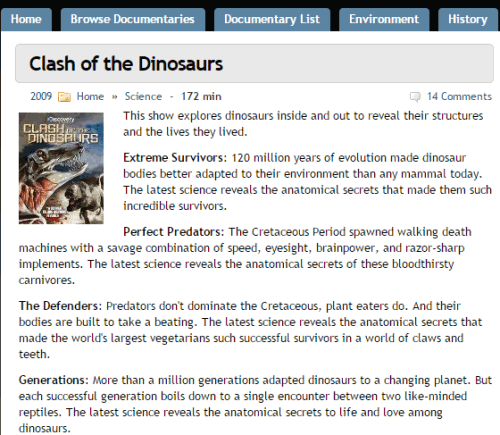 - You can browse documentaries by rating, comments, newest, and by title.
