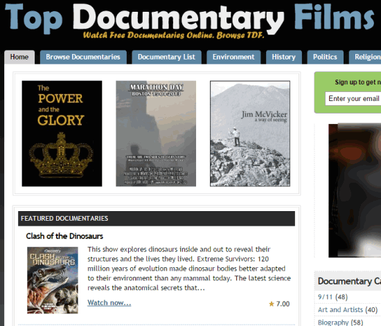Tap on the link added at the end this review to access the homepage of this website. After this, you can start exploring the documentaries available in this website without any sign up. However, you can also register with your email address to get updates about documentaries. Otherwise, simply browse and watch documentaries online free using this website.