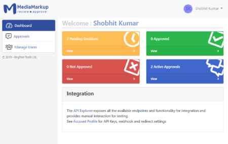 When you log in to MediaMarkup (upon signup), it shows you a dashboard. The dashboard lists the active approvals, approved, not approved, and pending decisions.