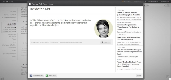 Good Noows is a simple and nice online RSS Reader. It pulls in all latest feeds from your favorite sources and organize them in a stylish way, without complication things on the interface. Good Noows is extremely easy-to-use, and it lets you read or share feeds in a convenient way. If you love to discover latest news from various web sources, Good Noows is a must try one!