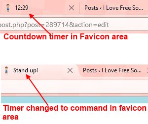 Once you start the timer, you can go back to working on any tab, the timer will run in the background. You will also be able to see the countdown timer in the favicon area of the tab. Once your timer runs out, you will see the timer in the favicon area change into a command asking you to stand up. You can then get off the chair, walk about for a minute and resume work after that. Just don’t forget to restart the timer again.